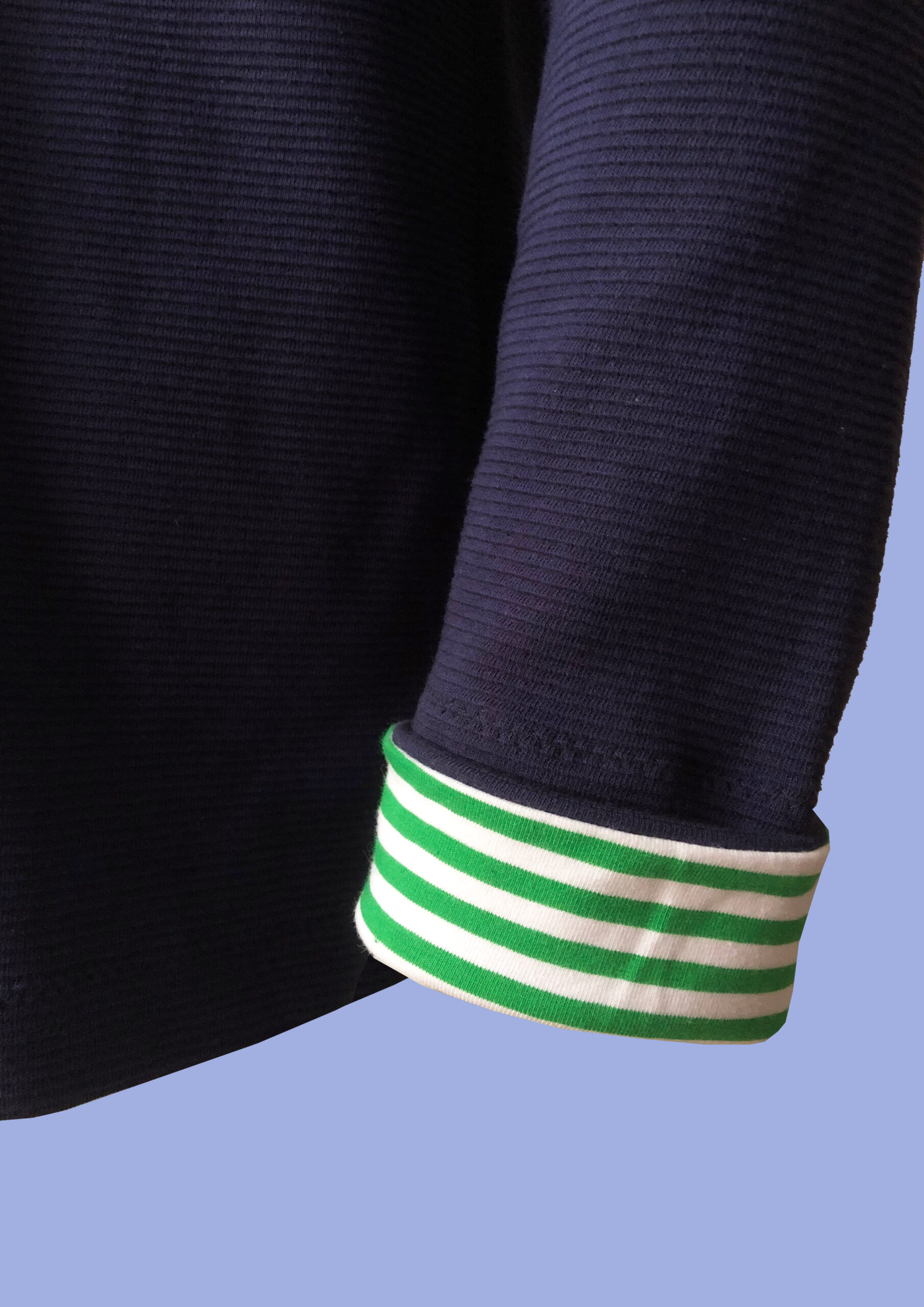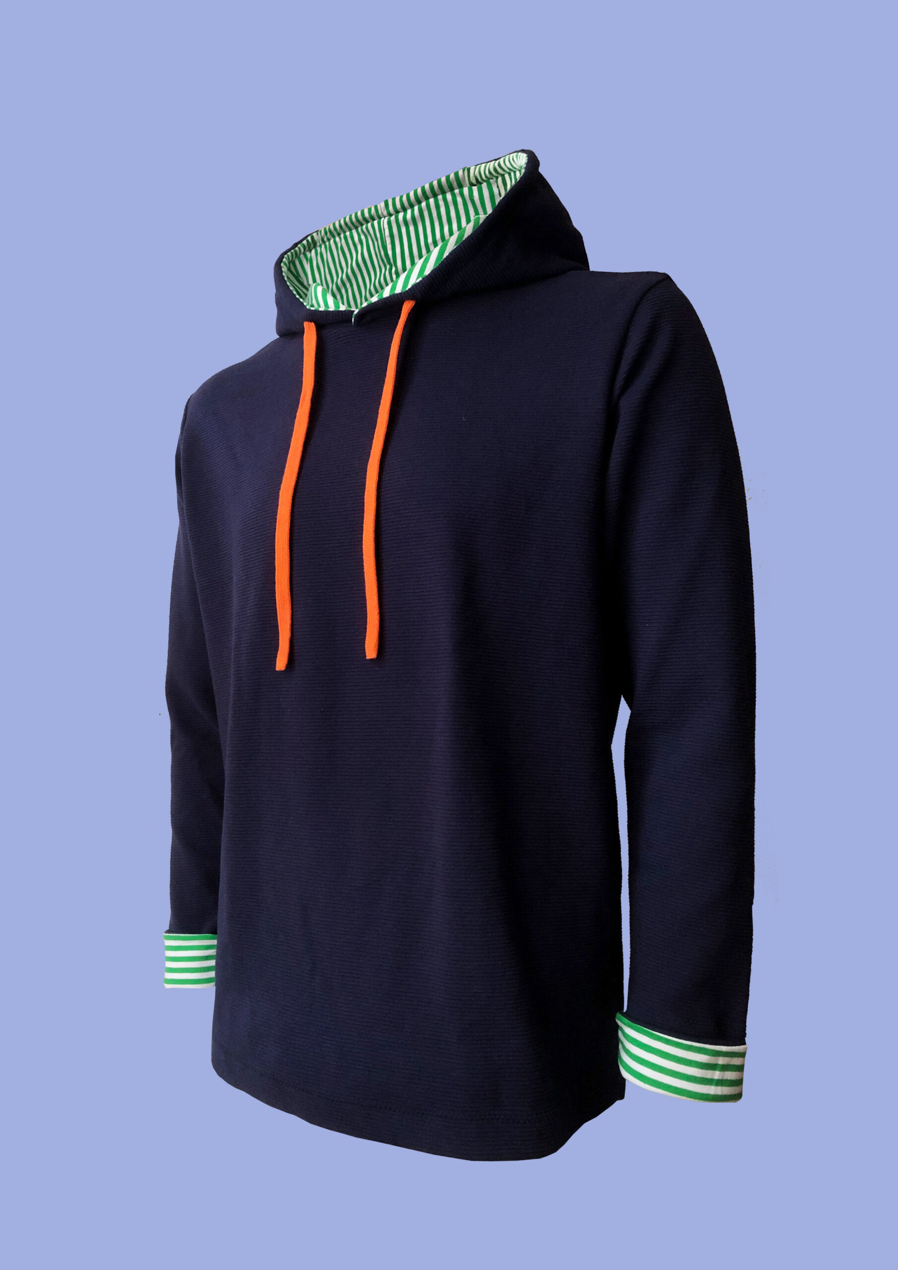 Kapuze und die Armausschnitte mit grün/weißem Streifen gefüttert