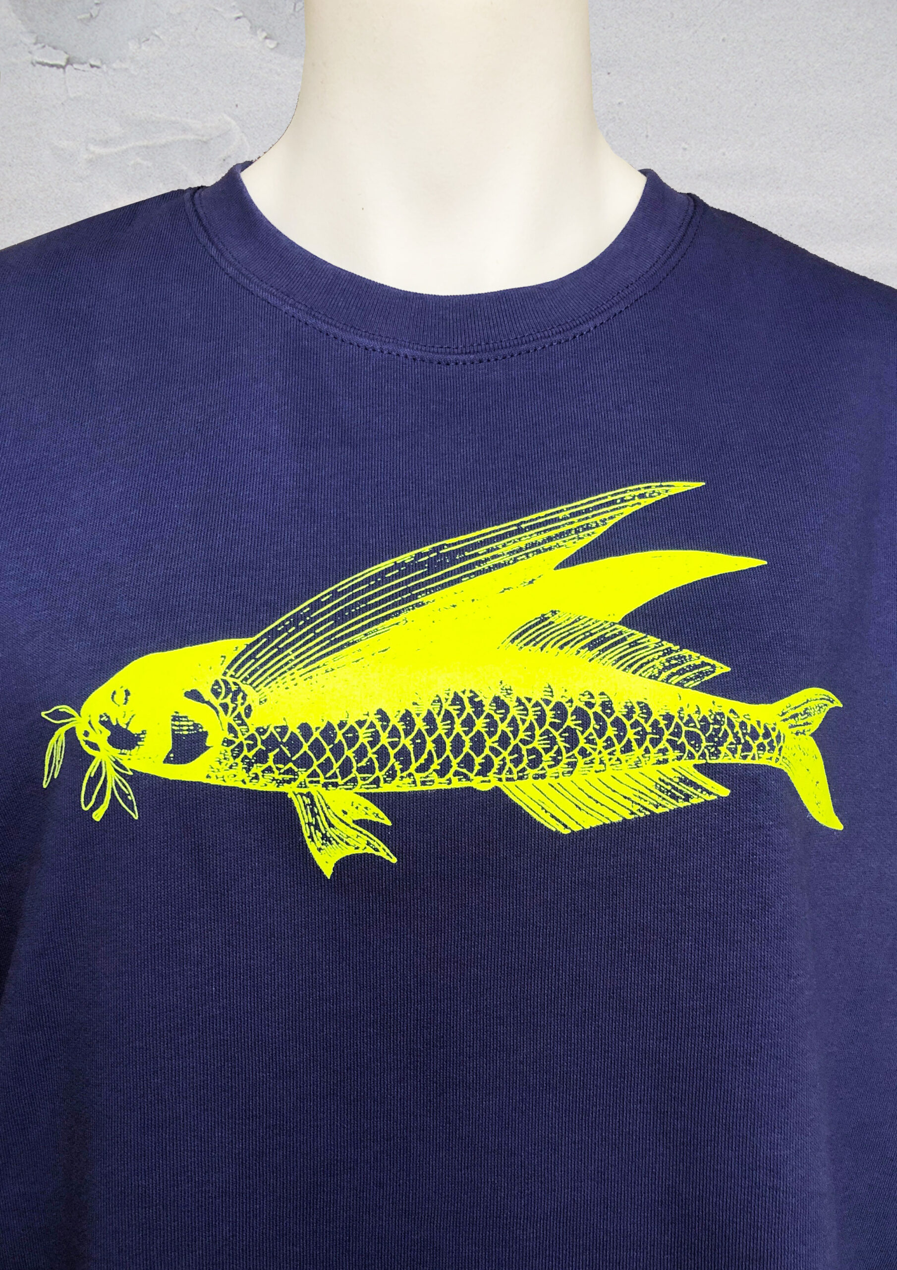 lilablauer BioSweater mit neongelbem Friedensfisch
